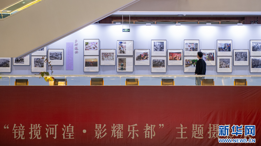 “国社之镜·世纪光影”新闻摄影展暨“镜揽河湟·影耀乐都”主题摄影展举办地海东市图书馆。新华网 潘彬彬 摄