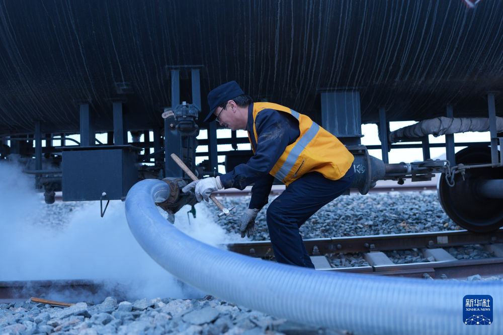 2月4日,韩景泉在放水过程中巡检列车,前面是工区储水井。新华社记者 齐芷玥 摄