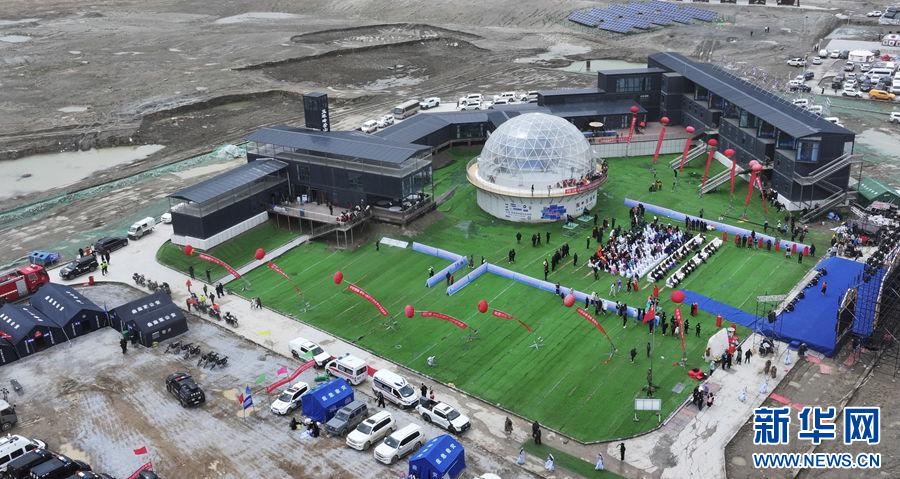 (资料照片)玉珠峰登山小镇全景(无人机照片)。新华网发(昂江 摄)