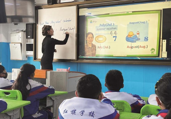 “Good morning, class. What day is it today?”屏幕那头,北京英语教师的声音清晰传来,镜头这边,本地教师抬手示意孩子们跟读,在一遍遍复读中,加深对单词的理解和记忆。
