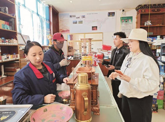 甘达村利众专业合作社成立于2010年。2013年,村里用集体积累的第一桶金搭配政府扶持资金,将闲置羊圈改建成几十平方米的小卖部。2015年,小卖部扩建升级为综合超市。2018年起,合作社开始从尼泊尔批量进口铜器,吸引了周边县乡群众前来选购。