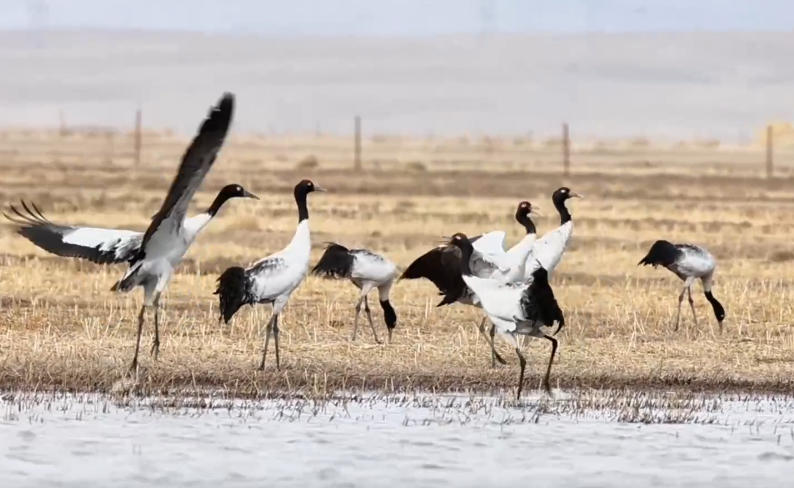 春日的青海湖畔,成群黑颈鹤如约而至。在青海湖北岸的青海省海北藏族自治州刚察县,黑颈鹤昂首挺胸、身姿挺拔。它们或列队漫步,或引颈长鸣、振翅翩跹,尽显高原珍禽的优雅气度,展现出人与自然和谐共生的生动图景。