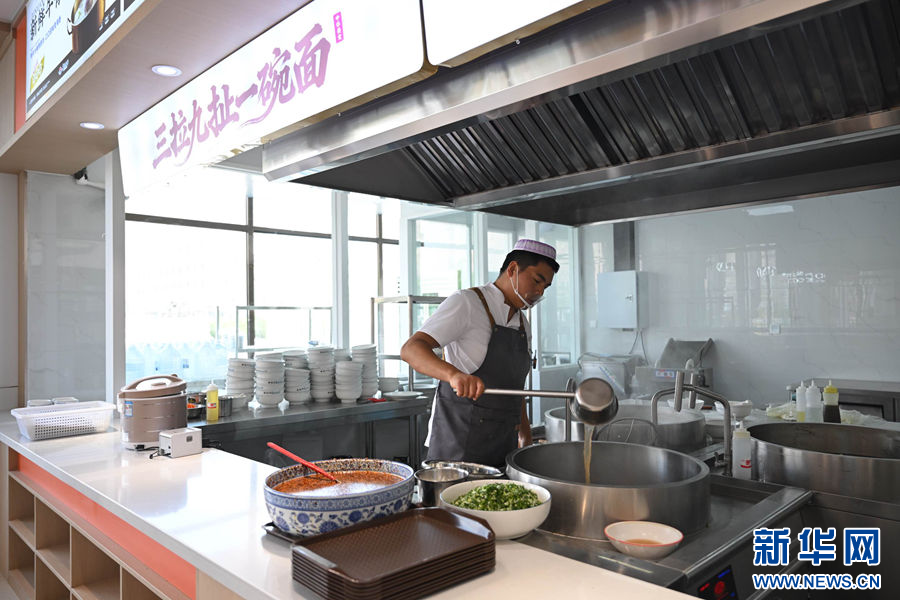 4月14日,拉面师傅在化隆牛肉拉面“3+N”体验店制作拉面。新华社记者 张龙 摄